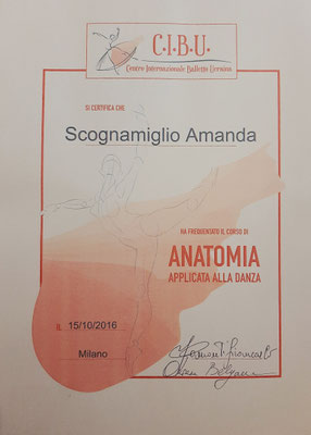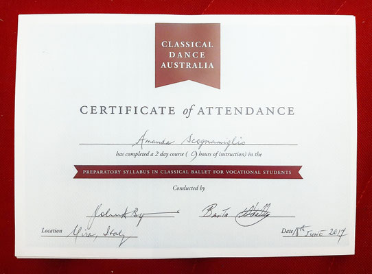 Approfondisce periodicamente lo studio dei livelli Vocational in Italia e in Inghilterra con le esaminatrici Cristina Zatti, Gillian Anthony, Jaqui Stuart. Appena nascono, studia i nuovi Syllabus R.A.D. con la direttrice artistica R.A.D. Lynn Wallis, loro creatrice.